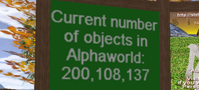 Sometime in the past few days, Alphaworld has reached the landmark 200 million objects in-world. It’s been hovering in the 190 million region for quite some time now, and someone finally pushed it over. *looks at Tauntaun*